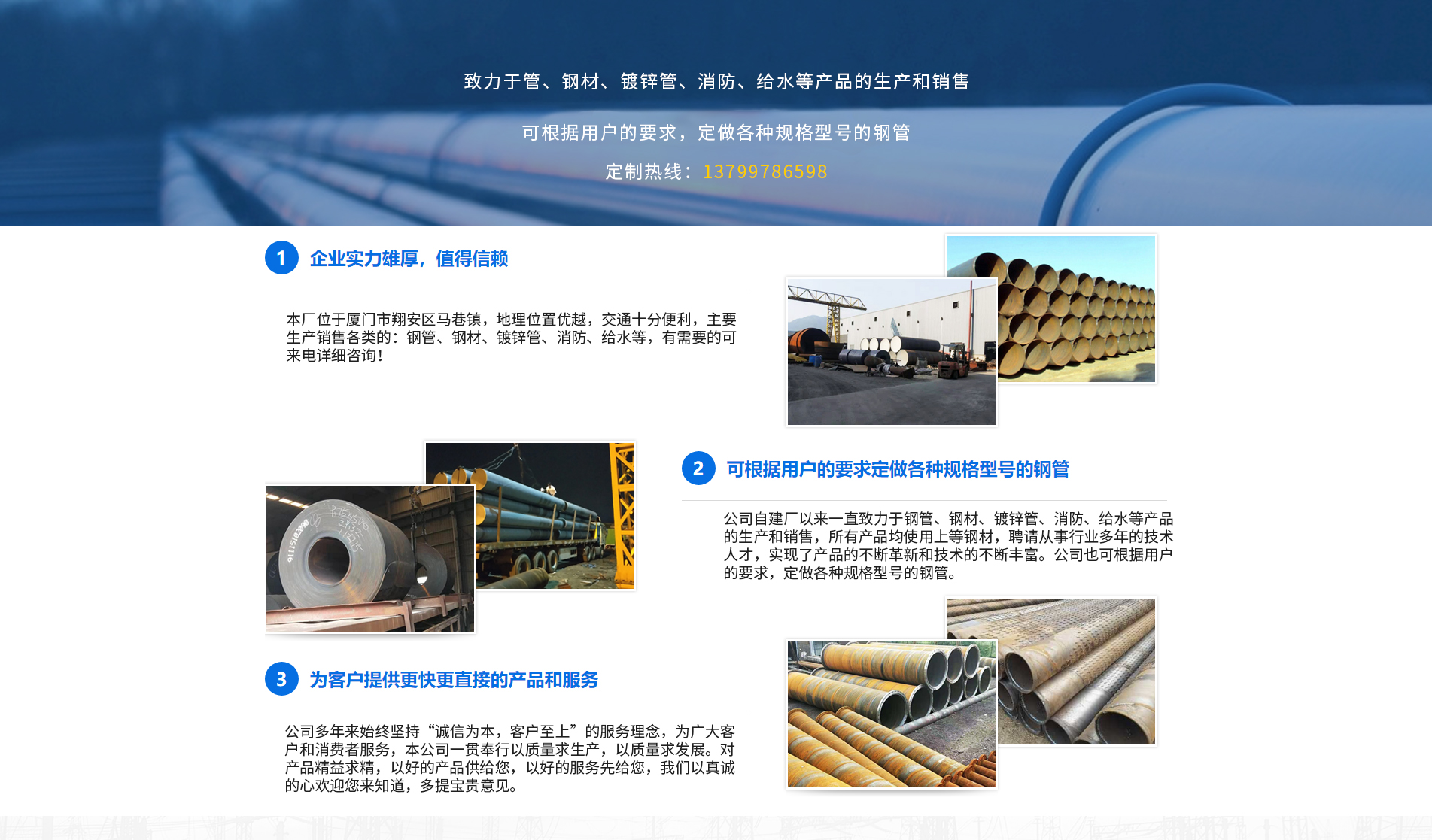 廈門方圓澤金屬材料有限公司主要生產(chǎn)銷售各類銀澤的:鋼管、鋼材、鍍鋅管、消防、給水等,產(chǎn)品被廣泛應用于天然氣、石油、化工、電力、熱力管網(wǎng)、水源等長距離輸送管道等,公司建立起了產(chǎn)品售前、售后服務規(guī)范,全過程滿足顧客要求,使我們的產(chǎn)品和服務深得顧客的信賴,與顧客建立起了長期合作互利關系。